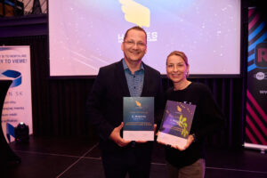 Cenu verejnosti za rok 2024 prevzali Marek Kopča a Lucia Hrašnová z marketingového oddelenia Hyundai Motor Slovakia. Foto: Matúš Lago